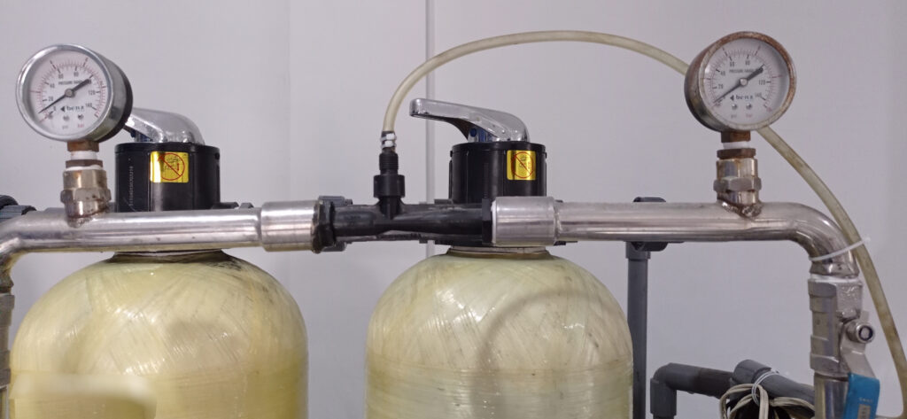 Filtrasi atau penyaringan menggunakan tabung media 1054 yang berisi pasir silika, karbon aktif coconut shell, dan karbon aktif coal. Lalu penyaringan dilanjutkan dengan media filter 20 mikron & 10 mikron.