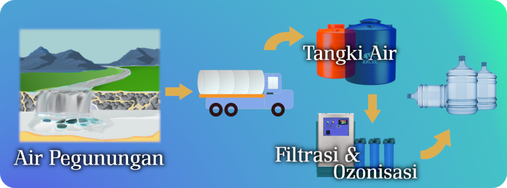 Secara ringkas, proses pengolahan air minum dimulai dari pengambilan bahan baku berupa air pegunungan yang bersih & jernih, dan menggunakan supplier yang terpilih. Air pegunungan tersebut dikirim dengan menggunakan truk tangki dengan kapasitas 8000 liter. Kemudian ditampung ke dalam tangki air dengan kapastitas yang besar. Lalu air ini mengalami proses filtrasi dan ozonizasi, dan selanjutnya dituangkan ke dalam galon air 20 liter.
